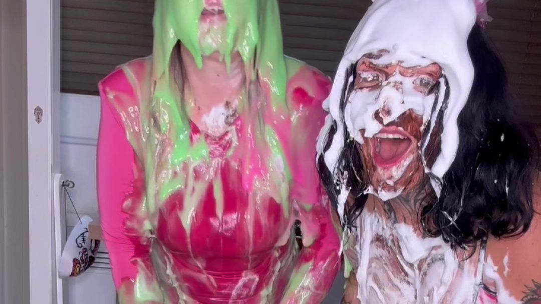 Sat patiently waiting for my bday cake, my bestie brings it in to me singing happy birthday I blow the candles out and before I know it, it's smashed in my face she then proceeds to get my birthday dress covered in pies and more cake! But have no fear I get her back... I cover her in gunge and pies until she can't see and looks like a complete state!